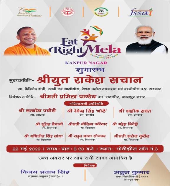 दिनांक 22 मई 2022 को छत्रपति शाहू जी महाराज विश्वविद्यालय कानपुर के छत्रपति शाहू जी महाराज इनोवेषन फाउंडेशन द्वारा खाद्य सुरक्षा एवं औषधि प्रशासन द्वारा आयोजित ईट-राइट मेले का आयोजन