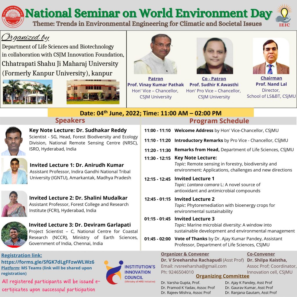 आज दिनांक 4 जून २०२२ को पर्यावरणदिवस के अवसर राष्ट्रीय संगोष्ठी का आयोजन छत्रपति शाहू जी महाराज इनोवेशन फाउंडेशन और डिपार्टमेंट ऑफ़ लाइफ साइंसेज के संयुक्त तत्वाधान में राष्ट्रीय […]