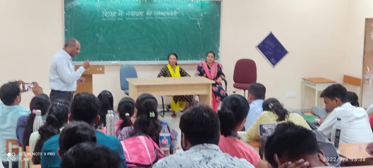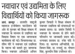 आज दिनांक 8 सितंबर 2022 को छत्रपति शाहूजी महाराज इन्नोवेशन फाउंडेशन के द्वारा शिक्षा संकाय में नवाचार के माध्यम से उद्यमिता का विकास विषय पर एक जागरूकता कार्यशाला का आयोजन B.Ed विभाग में किया गया जिसमें विभाग की विभागाध्यक्ष डॉ रश्मि गोरे जी ने कार्यक्रम के प्रारंभ में नवाचार एवं उद्यमिता के महत्व को बताया एवं विद्यार्थियों में जागरूकता लाई जा सके वक्ता के रूप में नवाचार अधिकारी अनिल कुमार त्रिपाठी ने शिक्षा संकाय में किस प्रकार नवाचार उद्यमिता के माध्यम से उद्यमिता के पथ पर आगे बढ़ा सकता है अपनी जीवनशैली में किस प्रकार के परिवर्तन हमको लाने होंगे जो हमको हमारी भविष्य की योजनाओं में सफल बनाने में सहयोग प्रदान करेंगे , वक्ता के रूप में डॉ प्रशांत त्रिवेदी ने कौन-कौन से आ गया आपकी जीवनशैली में परिवर्तन ला सकते हैं इस पर विस्तार पूर्वक चर्चा की कार्यक्रम के समापन पर धन्यवाद प्रस्ताव डॉ स्नेह पांडे के द्वारा प्रदान किया गया कार्यक्रम में लगभग 60 विद्यार्थियों ने सक्रिय प्रतिभाग किया। कार्यक्रम में मुख्य रूप से डा कल्पना अग्निहोत्री, डॉ विमल सिंह, डॉ रत्नार्तु डॉ गोपाल सिंह, कुलदीप सिंह आदि उपस्थित रहे।