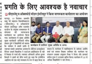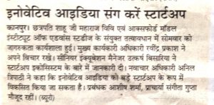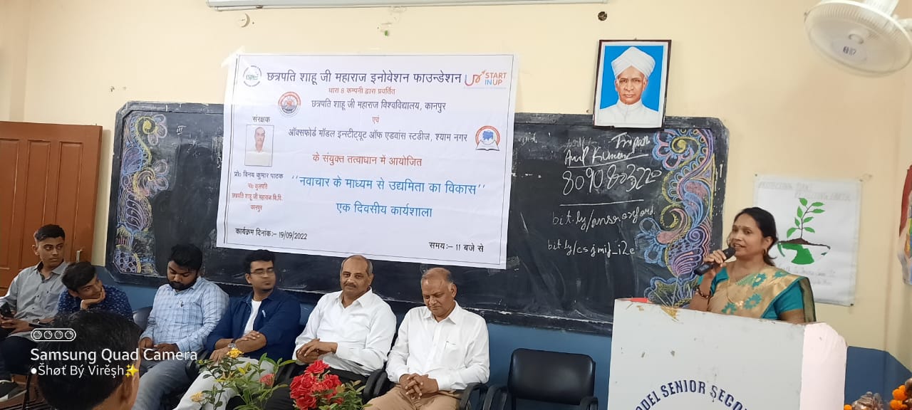 आज दिनांक 19 सितंबर 2022 को प्रातः 11 बजे छत्रपति शाहू जी महाराज विश्वविद्यालय एवं ऑक्सफोर्ड मॉडल एडवांस स्टडीज महाविद्यालय, श्याम नगर, कानपुर के संयुक्त तत्वावधान में एक जागरूकता कार्यशाला का आयोजन किया गया। उक्त कार्यशाला में मुख्य अतिथि के रूप में रवींद्र प्रकाश दुबे, मुख्य कार्यकारी अधिकारी ने अपने संबोधन में बताया कि नवाचार हमारी उद्यमिता एवं प्रगति का एक अभिन्न अंग है। समस्याओ में ही समाधान परिलक्षित होते हैं। बस हमें अपनी सूक्ष्म दृष्टि को विकसित करने की आवश्यकता है।कार्यक्रम में अतिथि के रूप में सीनियर इनक्यूबेशन मैनेजर उत्कर्ष बिसारिया जी ने अपने संबोधन में स्टार्टअप इकोसिस्टम के बारे में विद्यार्थियों से विस्तार पूर्वक चर्चा की। नवाचार अधिकारी अनिल कुमार त्रिपाठी ने बच्चों को प्रेरित करते हुए किस प्रकार अपने इनोवेटिव आइडिया को एक बड़े व्यवसाय के रूप में खड़ा किया जा सकता है इस पर विस्तार पूर्वक चर्चा की। कार्यक्रम का संचालन, प्रवक्ता अंशुमन मिश्रा जी द्वारा किया गया। कार्यक्रम का समापन महाविद्यालय की प्राचार्या डा. संगीता गुप्ता जी द्वारा, धन्यवाद प्रस्ताव के साथ हुआ। इस कार्यक्रम में लगभग 50 से अधिक विद्यार्थियों ने प्रतिभाग लिया