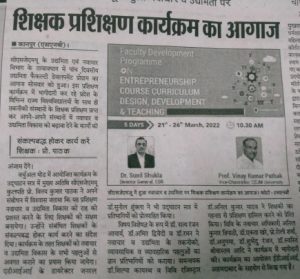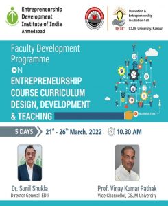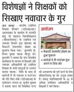 दिनांक 21 मार्च से 26 मार्च 2022 को छत्रपति शाहू जी महाराज विश्वविद्यालय के नवाचार विभाग में आनॅलाइन ई.डी.आई.आई अहमदाबाद के सहयोग से फैकल्टी डेवलपमेंट प्रोग्राम का शुभारंभ किया गया। इस प्रशिक्षण कार्यक्रम में भागीदारी कर रहे प्रदेश के विभिन्न राज्य विश्वविद्यालयों के साथ ही तकनीकी संस्थानों के शिक्षक प्रशिक्षण प्राप्त कर अपने-अपने संस्थानों में नवाचार व उद्यमिता विकास को बढावा देने के कायों को अंजाम देगे। वर्चअल मोड में आयोजित कार्यक्रम के उद्घाटन सत्र में मुख्य अतिथि कुलपति प्रो0 विनय कुमार पाठक, ईडीआईआई के डाइरेक्टर जनरल डॉ0 सुनील शुक्ला, विवि रजिस्टार डॉ0 अनिल कुमार यादव, समन्वयक डॉ0 शिल्पा कायस्थ, विषय विशेषज्ञ के रूप में सत्य रंजन, डॉ0 अमित द्विवेदी व डॉ0 रमन, डॉ0 एकता खरे, व नवाचार अधिकारी और संबद्ध महाविद्यालयों के 60 से अधिकनवाचार अधिकारियों ने व शिक्षकों ने भाग किया।